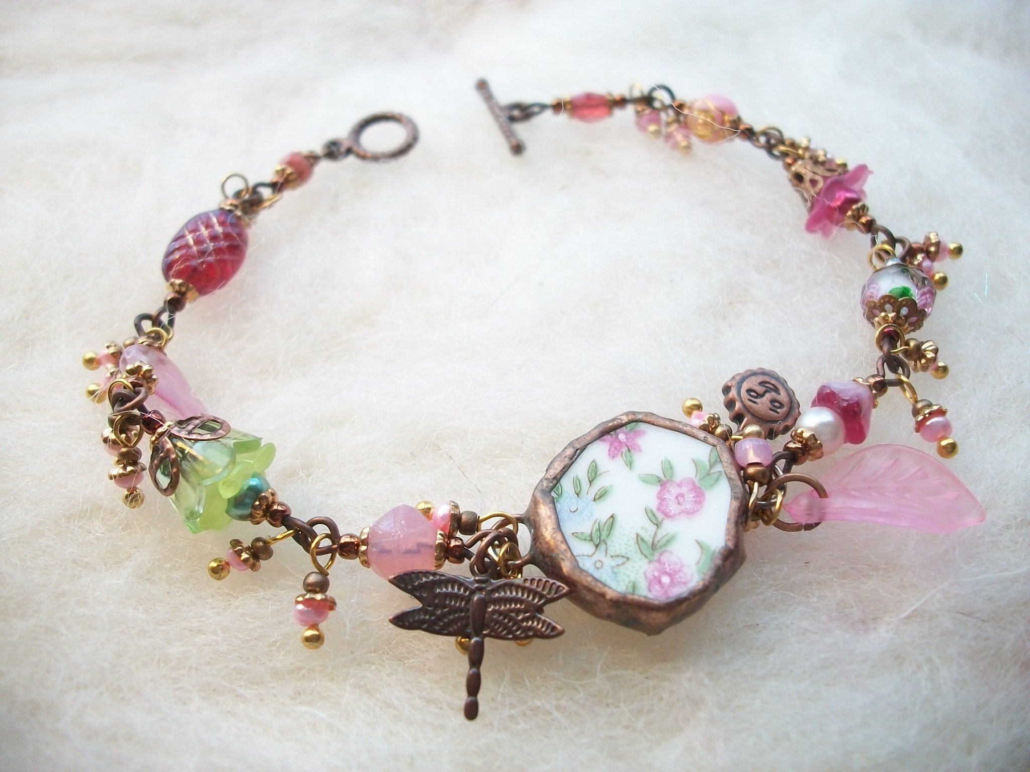 A magical blend of colorful fairy wares. flower hair clips, flower crowns and headbands. silk velvet shoulder bags and scrunchies. jewelry made from recycled broken china, gemstone necklaces, garden prayer flags and lucite and Czech glass bead jewelry.