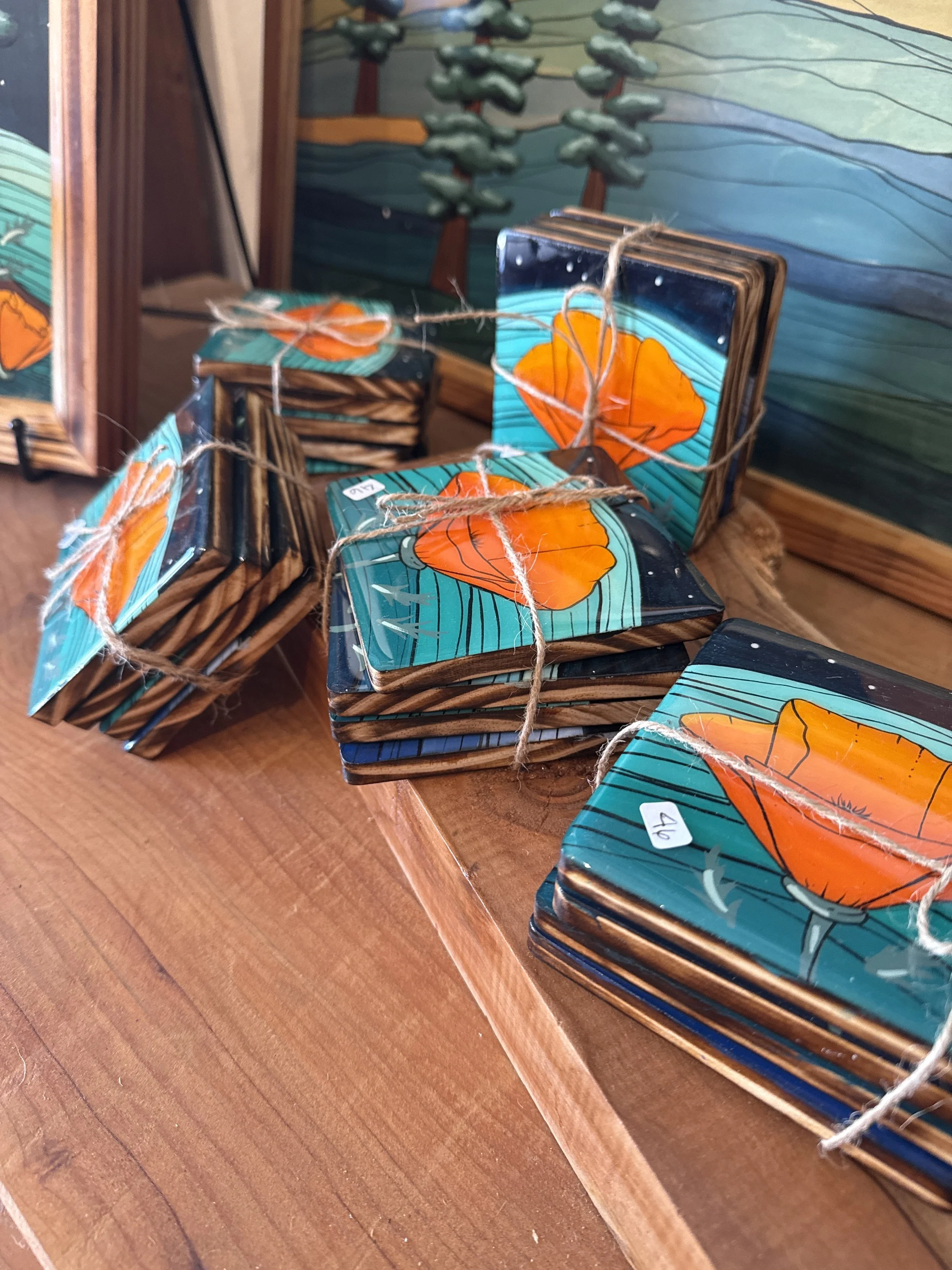 Original paintings done in gouache and acrylic on wood. My work draws from familiar elements such as the ca poppy, redwood forest, and mountain forms. Rendered in simple shapes with bold expressive colors. The landscapes are intentionally ambiguous to allow for the viewer to project their own memories and emotions on the scene.