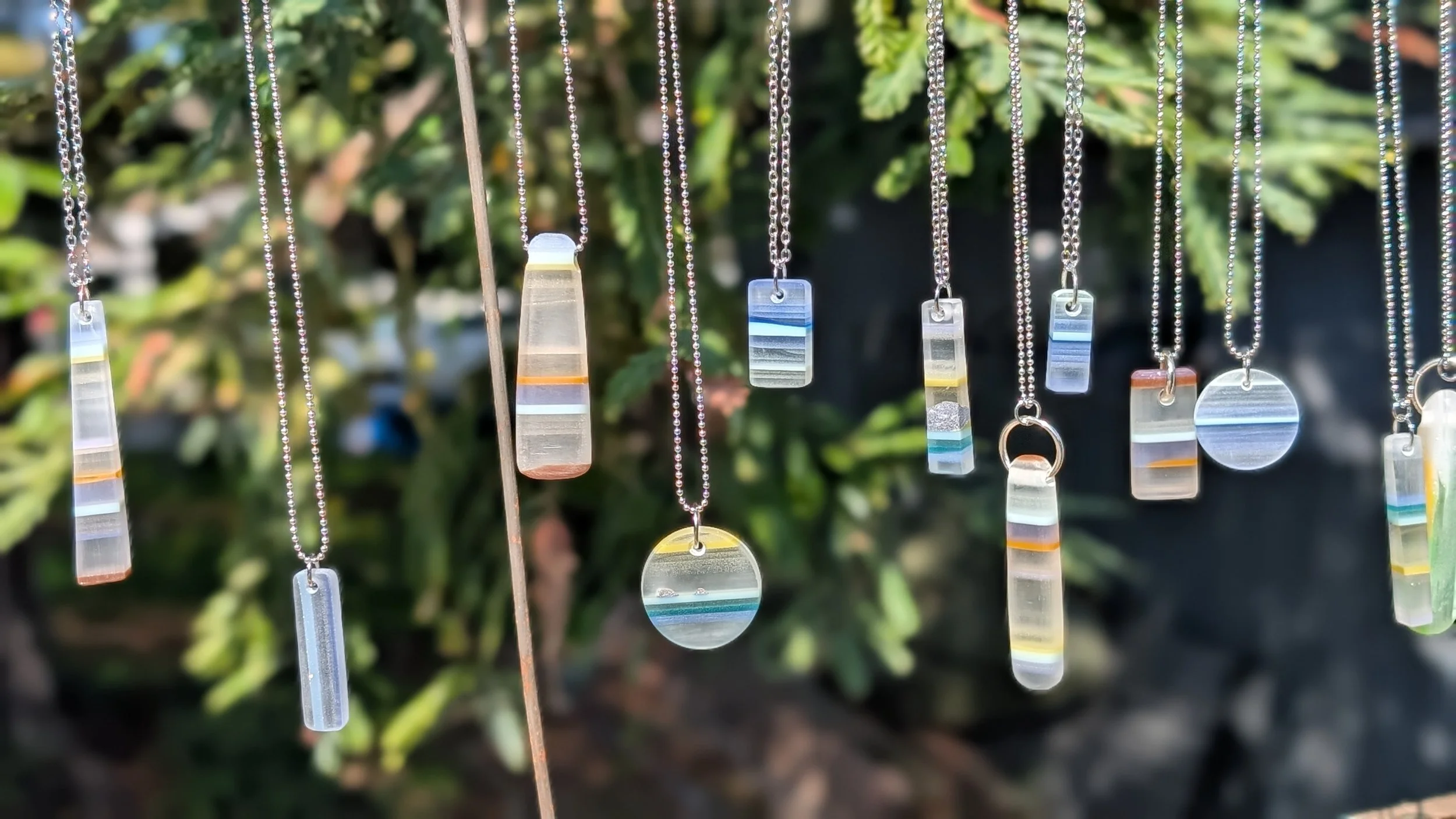 Handmade sun catchers made with driftwood, sea glass and other beach finds and crystals. Jewelry and other accessories made from Surfite (repurposed surf board resin). Also, graffiti art paintings on canvas. Inspiration from the ocean is what all three of these mediums have in common.